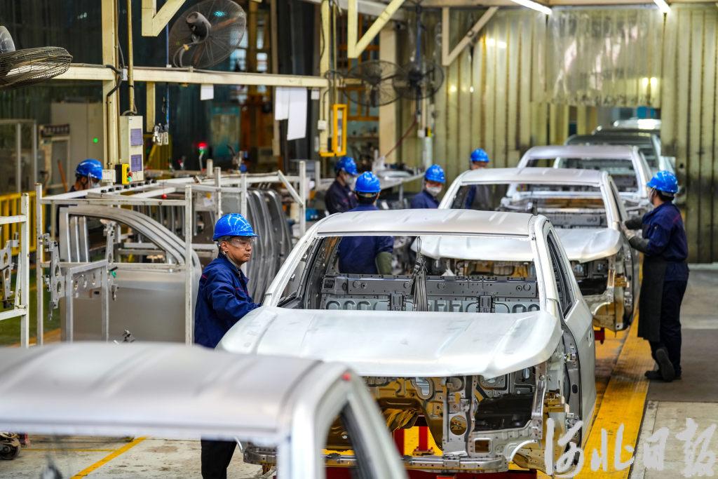 4月15日,河北长安汽车有限公司焊接车间,员工在生产线上作业。河北日报记者 许佳奇摄