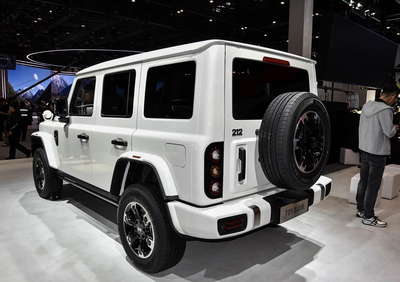 再来看车尾部分,车尾设计简洁硬朗,垂直的车尾造型保证了后备箱的装载空间。外挂式备胎是硬派越野的标志性元素,212 T01新能源将其保留,同时采用了电动解锁设计,提升了使用便利性。尾灯采用了竖置设计,与车头的圆形大灯形成呼应,点亮时辨识度极高。后保险杠上的银色护板与前保险杠相呼应,进一步强化了硬派越野的风格。后备箱采用了侧开式设计,开口宽大,方便装载大件物品。