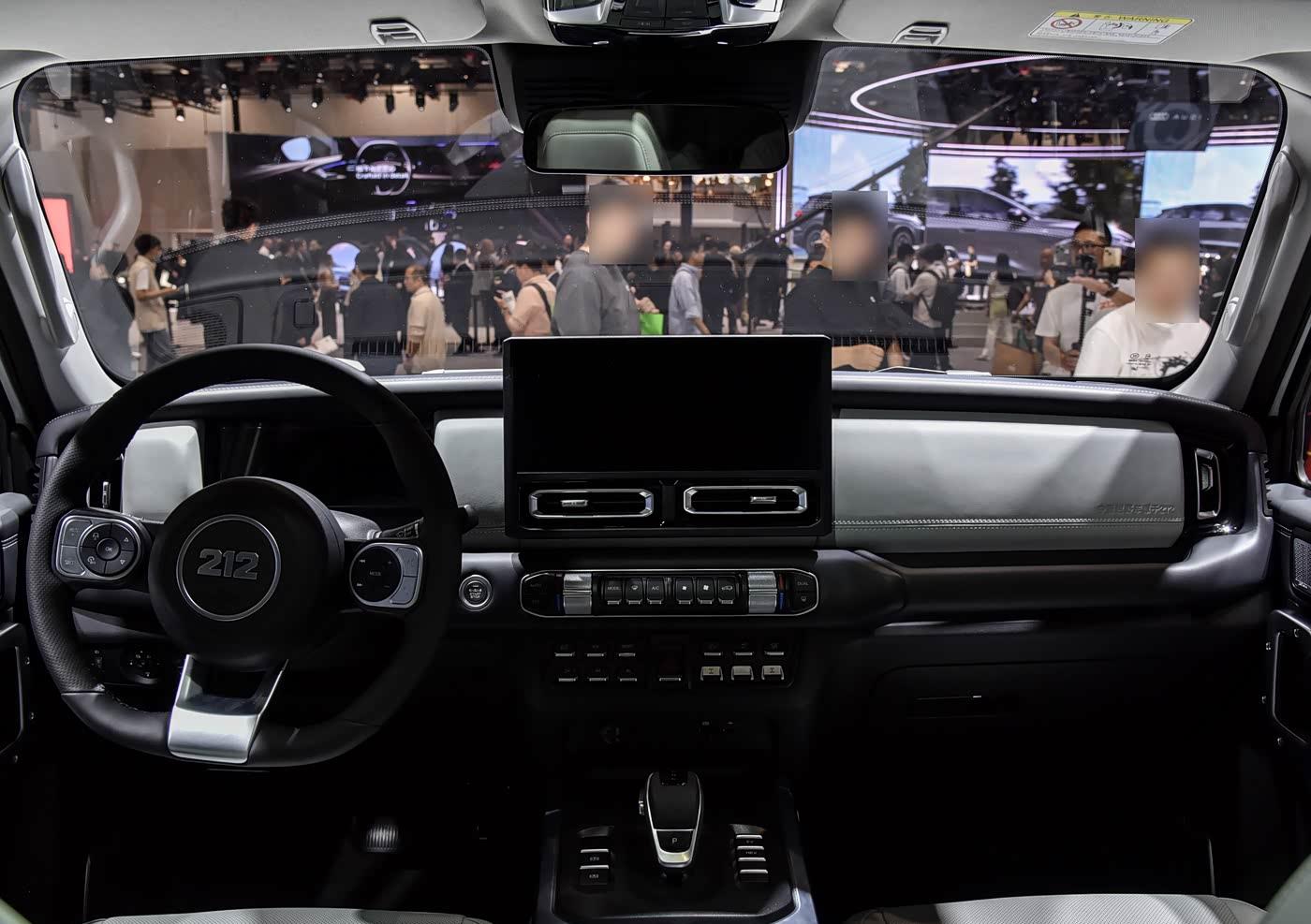 进入车内,内饰一改老款 212 的简陋,采用 “硬核实用 + 科技舒适” 双理念设计。中控台布局规整,12.3 英寸全液晶仪表 + 10.25 英寸悬浮中控屏组成科技核心,搭载智能车机系统,支持导航、语音控制、手机互联等功能,流畅度满足日常。方向盘为三辐式复古造型,多功能按键齐全;副驾驶前方配备越野专属扶手,提升颠簸路段稳定性。空间表现越级,2860mm 轴距带来宽敞五座布局。180cm 体验者前排头部一拳三指,后排腿部两拳、头部一拳两指,纯平地板提升中间乘客舒适度。后备箱常规容积 420L,放倒后排座椅可拓展至 1200L。